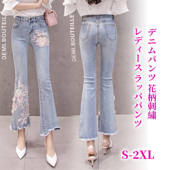 デニムパンツ 花柄刺繍 レディース ラッパパンツ ジーンズ ジーパン 刺繍 大きいサイズ 着痩せ デニム ...